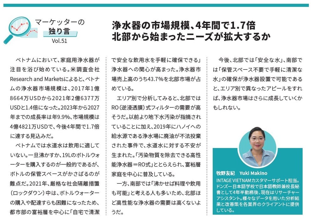 [Article] “Market size of water purifiers grew 1.7 times in 4 years – demand started in the north is expected to spread to the south” from ACCESS (Oct. 2022)