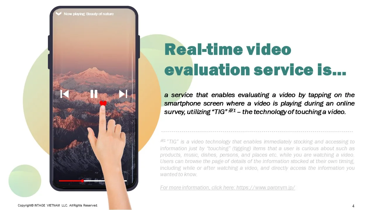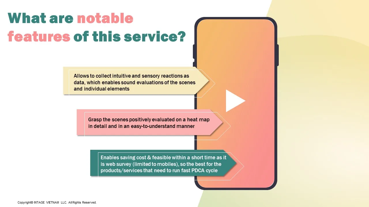 Outreaching what traditional way of video evaluation has offered; our new technique exclusively developed by INTAGE Inc. enables businesses to reflect the intuitive reactions of target audience while providing a closer understanding of individual elements in every single scene.