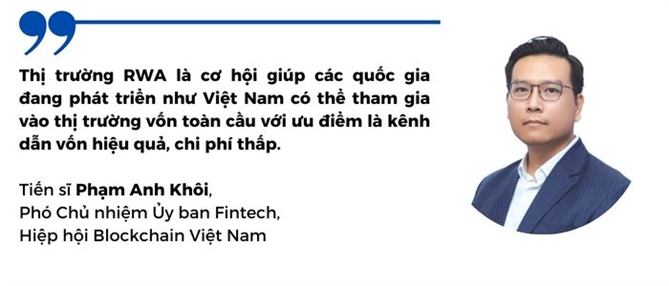 Trong đó, theo Hiệp hội Blockchain Việt Nam, token hóa tài sản thực (RWA) có thể lên tới 10% GDP toàn cầu vào năm 2030, tương đương 16.000 tỉ USD. Tiến sĩ Phạm Anh Khôi, Phó Chủ nhiệm Ủy ban Fintech, Hiệp hội Blockchain Việt Nam, cho rằng thị trường RWA là cơ hội giúp các quốc gia đang phát triển như Việt Nam có thể tham gia vào thị trường vốn toàn cầu với ưu điểm là kênh dẫn vốn hiệu quả, chi phí thấp cho các dự án có tài sản thực tại Việt Nam.
