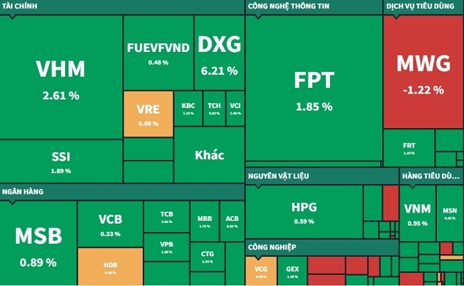 Xét về từng cổ phiếu riêng lẻ, dữ liệu của Công ty Chứng khoán VNDirect cho thấy, VHM, FPT, CTG, TCB và BID là những cổ phiếu tác động tích cực nhất đến diễn biến của chỉ số. Trong khi đó, MWG, VTP, GAS là những mã dẫn đầu trong việc “kéo lùi” VN-Index.