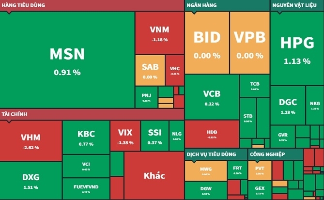 Thị trường giao dịch khá trầm lắng khi chỉ có hơn 10.800 tỉ đồng được giao dịch ở sàn HOSE, mức thấp nhất trong hơn 1 tháng qua. VN-Index kết phiên tăng hơn 2 điểm lên mức 1.254 điểm với 211 mã tăng và 162 mã giảm. Nhóm cổ phiếu VN30 ghi nhận mức tăng gần 2,8 điểm, giá trị giao dịch của nhóm này chiếm gần 60% tổng giá trị giao dịch ở sàn HOSE.