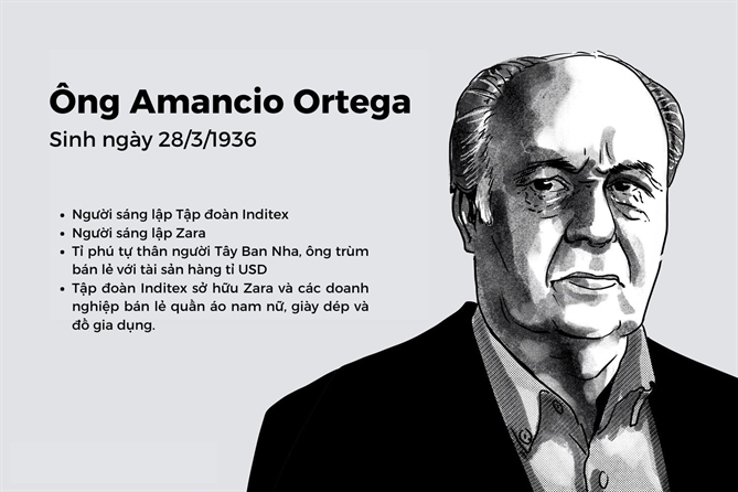 Ông Amancio Ortega, nhà sáng lập và Chủ tịch tập đoàn bán lẻ Inditex, được biết đến là người sáng lập của thương hiệu Zara, một trong những nhà bán lẻ thời trang lớn nhất thế giới. Ông là người giàu nhất Tây Ban Nha và cũng nằm trong danh sách những tỉ phú giàu có nhất toàn cầu. Hiện tài sản của ông đang ở mức hơn 120 tỉ USD đứng thứ 10 thế giới, theo Forbes (ngày 22/11).