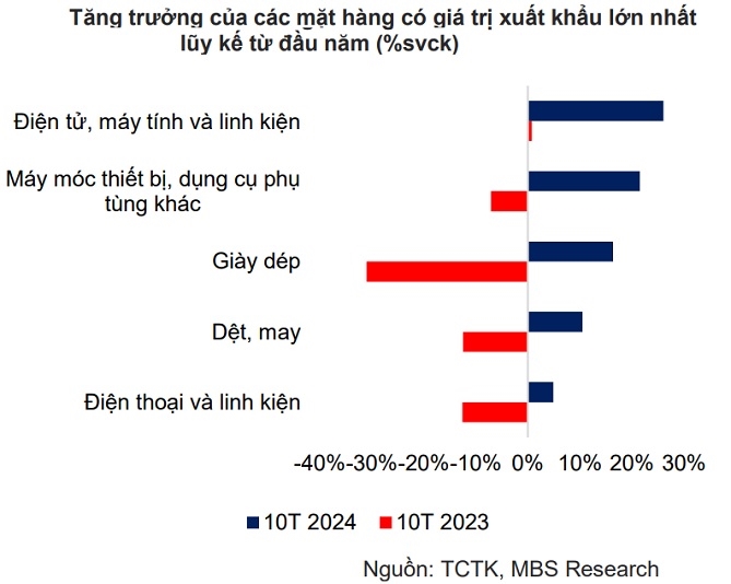 Ở chiều ngược lại, MBS cho rằng tăng trưởng xuất khẩu của Việt Nam trong năm 2024 phải đối mặt với nhiều thách thức như xung đột địa chính trị có thể dẫn đến tăng đột biến chi phí vận chuyển; sự cạnh tranh gia tăng tạo ra bởi các quốc gia xuất khẩu đối thủ như Trung Quốc, Indonesia và Thái Lan.