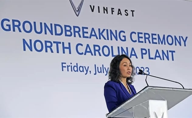 VinFast CEO Thuy Le speaks at the groundbreaking ceremony for the company’s manufacturing plant in the U.S. state of North Carolina on July 28. Photo by Nikkei Asia.